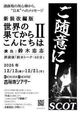 本日(20日)は武蔵野市の吉祥寺シアターにて、劇団SCOTによる「世界の果てからこんにちはU」(新装改編版)を見て来ました。今回は東京では初めての試みとして、切符を売らず・「お志をご随意に」というスタイルでありました。終演後に演出の鈴木忠志によるトークあり。本年(2025)はこれにて観劇納めとなります。
