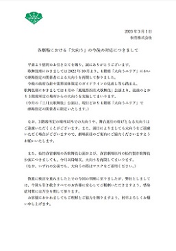 記録のためにメモしておきます。政府のコロナ対策ガイドラインに従い、松竹は直営各劇場において、3月13日より、マスクの着用を「推奨」とさせていただきます」とのことです。何だか歯切れの悪い文章ですが、個人の判断によりマスクを外す選択肢も「あり」ということですね。まあしばらくは周囲の様子を見ながらの判断と云うことになりそうです。