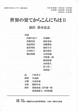 本日(20日)は武蔵野市の吉祥寺シアターにて、劇団SCOTによる「世界の果てからこんにちはU」(新装改編版)を見て来ました。今回は東京では初めての試みとして、切符を売らず・「お志をご随意に」というスタイルでありました。終演後に演出の鈴木忠志によるトークあり。本年(2025)はこれにて観劇納めとなります。
