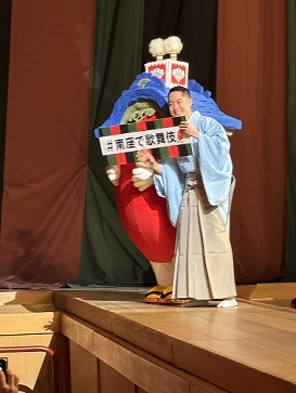 隣の赤いのは、南座のゆるキャラ・「みなみーな」クン。