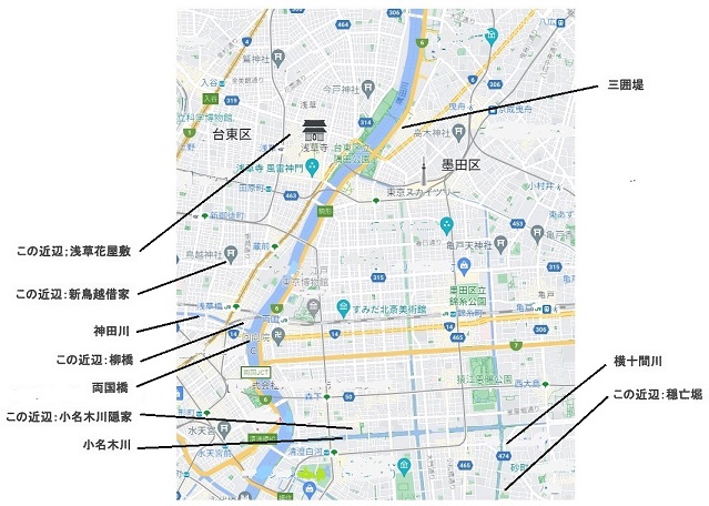 「菊宴」2幕目は、オリジナル脚本(昭和59年上演)の配列であると、新鳥越借家・隅田川花屋敷・三囲堤・柳橋両国・小名木川隠家の順番です。(今回の上演では花屋敷の場は上演されません。)各場は隅田川(大川)の流れを軸に配列されています。文政4年(1821)初演河原崎座の観客は江戸の地理が頭に入っていますから、隅田川の流れに沿って筋の展開を理解します。そうすると、今回上演のように柳橋両国の場が小名木川隠家の後に来ることはあり得ないことが分かります。まず地図で各場の凡その位置をご確認ください。